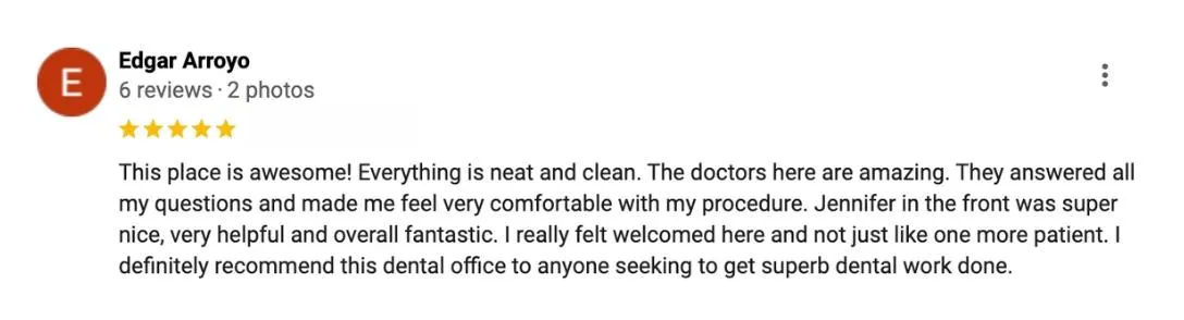 "This place is awesome! Everything is neat and clean. The doctors here are amazing. They answered all my questions and made me feel very comfortable with my procedure. Jennifer in the front was super nice, very helpful and overall fantastic. I really felt welcomed here and not just like one more patient. I definitely recommend this dental office to anyone seeking to get superb dental work done."