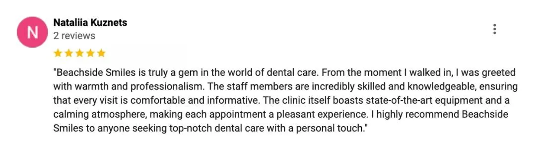 "Beachside Smiles is truly a gem in the world of dental care. From the moment I walked in, I was greeted with warmth and professionalism. The staff members are incredibly skilled and knowledgeable, ensuring that every visit is comfortable and informative. The clinic itself boasts state-of-the-art equipment and a calming atmosphere, making each appointment a pleasant experience. I highly recommend Beachside Smiles to anyone seeking top-notch dental care with a personal touch."